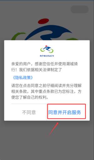 1、阅读并勾选同意用户协议后,即可开启应用全部功能。此步骤是使用共享单车服务的首要环节。