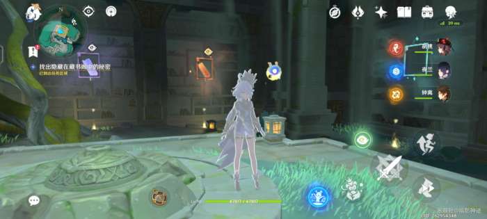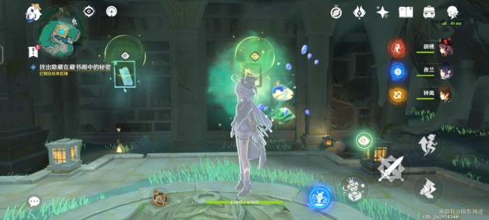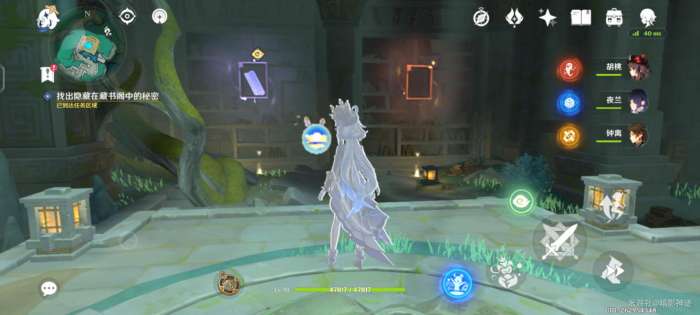 接下来我们回到这里,打开元素视野后会发现书架中间的区域会发光,分别调查一下书架,我们会发现这四个书架从右向左分别是与『岩石』『霖雨』『炎夏』『雷霆』有关,而且卷宗都有特定的颜色,接下来的任务应该是将它们进行排序