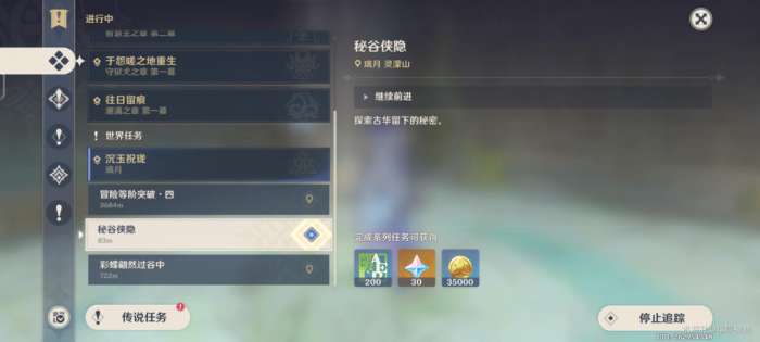 当我们排好序后,这里的任务就完成了,解锁下一个『秘谷侠隐』任务奖励:冒险阅历x200 原石x30 摩拉x35000
