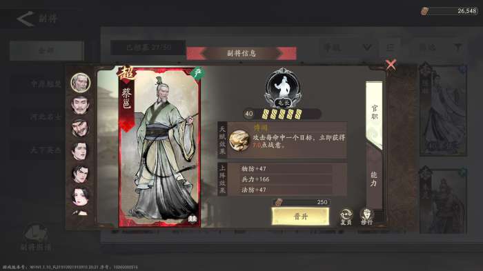 ①【横刀跃马】:对敌物攻130%的伤害,且技能升职二阶后附加〔虚弱〕〔易伤〕效果,持续2回合,是点杀敌方将领的大杀器。