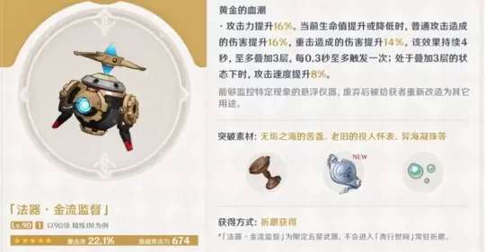 金流监督是一款看起来像无人机的五星法器,实际上是莱欧斯利的专属武器。满级属性面板包括674点白值和22.1%暴击率。其精1特性为始终提供16%的攻击力加成,当生命值变动时,普通攻击和重击的伤害也会提升,最多可以叠加3层。当叠满3层后,还会有额外的攻击速度提升效果。