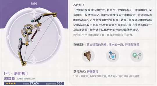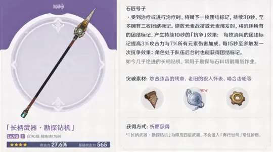 接下来是两把四星限定武器,分别是长和弓箭。勘探钻机和测距规。它们的面板和特性完全一致,武器满级后,白值可以增加27.6%的攻击力。精1特性是,在受到治疗或进行治疗时,会赋予一枚团结标记,最多可以拥有3枚;释放战技或大招时,会消耗所有标记,获得对应的攻击力和全元素加成。后台也能获得团结标记。