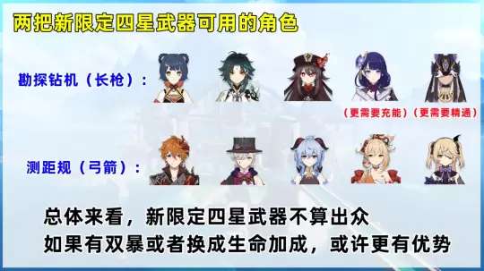 角色多为辅助型,能用勘探钻机的只有香菱、魈和胡桃,但香菱和胡桃并不特别适配。赛诺和雷神更需要精通和充能。弓箭角色中,汤达人可以使用,并且林尼、宵宫、甘雨也可以考虑使用。但是这些角色本来就有相当适配的专武和平替武器,并且新的限定武器没有双倍爆击,这有些尴尬。也许将其修改为像枫丹一样的生命值副词条和加成,会有属于自己的优势。