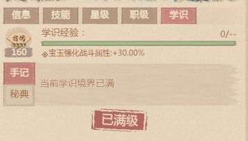 4、学识提升:通过手记和秘典提升学识等级,可增加宝玉属性加成和僚属基础属性。注:僚属11行解锁全部学习等级,最高160级
