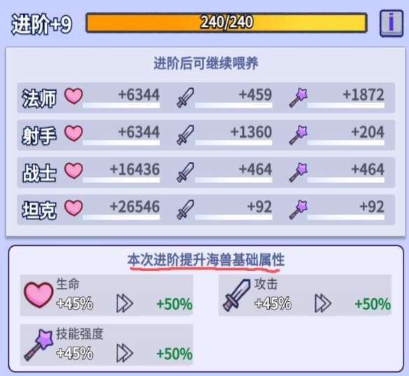 进阶这个模组实际上用处不大,因为给的属性太少了,升到12阶加的属性也就几万血、几千攻击,还不如升1级英雄加的属性多,并且每次进阶时加的百分比其实是给升级页面的海兽基础属性加的,而不是给英雄加百分比,所以实际加的属性很少,只能说聊胜于无了,有多的材料可以升,没必要特意升。