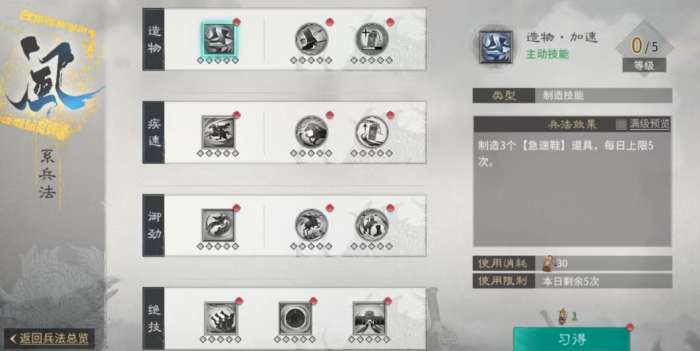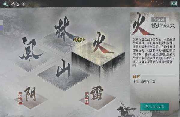 风系兵法主要是以机动制胜作为核心,对速攻型玩家而言是一个主要的选择。在激活之后,可以制造急行军道具,让部队在沙盘上可以疾行如飞。加速时还能收获士气维持以及视野扩展等效果。城池战斗中的全体加速指令,搭配跨区域传送门的功能,让乙方的部队快速的集结,大幅度的缩短相应的时间。风系兵法可以让玩家在快节奏对战的过程中,拥有更多的优势,比较适合擅长临场指挥,以及主动出击的英雄。