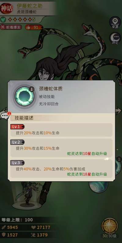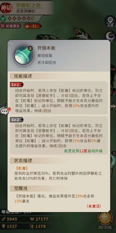 颈槽蛇体质作为伊藤蛇之助的基础增益能力,其中基本就是在上场的时候就可以直接触发的,触发这个效果之后,在上面可以提升伊藤蛇之助20%攻击和10%生命数值,最多的时候是将此类增益技能升级到3级,这个时期提升的数值就到了40%攻击、20%生命和5%伤害加成了,而这个增益基本也是在他达到18星级的时候才可以触发到的强度,最后一个技能叫做狩猎本能,根据伊藤蛇之助最后的这个被动效果,在回合开始的时候,此时场上要是存在蛇毒标记的单位,伊藤蛇之助可以立即对合格目标发动一次恶堕蛇手的技能攻击,而后续这个技能效果会冷却3回合,当然要是当时场上不存在蛇毒标记的敌人,那么此时就会给敌方生命百分最低的那位目标施加一层蛇毒的效果,这个效果在一战斗开始时,就可以让伊藤蛇之助获得10%攻击提升的增益效果。