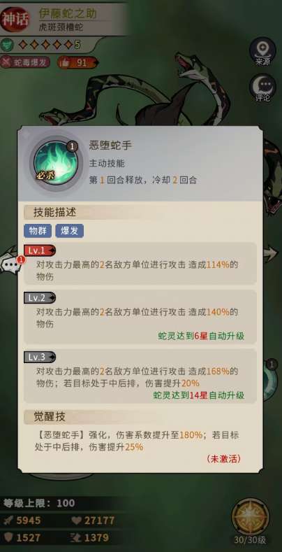 伊藤蛇之助在现在的强度当中其实利用毒素能力来积攒多次的输出是非常不错的,利用蛇毒爆发可以带来的各种能力也是他主打的一类输出途径,恶堕蛇手这个技能作为他最基础的物理群攻技能,可以带来的爆发能力也很强,输出的时候可以对攻击力最高的2名敌方单位进行攻击,造成114%的物伤,后期升星之后如果攻击的目标处于中后排,伤害则会有提升20%,恶堕蛇手这个技能在强化之后,伤害系数提升至180%;若目标处于中后排的话,觉醒的伤害数值会提升25%。
