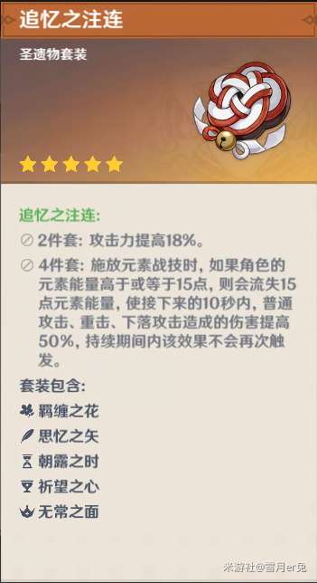 (2)建议在圣遗物上选择剧团套装(不是乐团套),如果生命值不足35000,可以考虑选择生命沙来增加生命属性,并凑齐双水BUFF。如果生命值够了,可以考虑充能沙。在选择主属性时,如果水伤害杯的要求已经满足,可以考虑选择生命或水元素伤害加成。