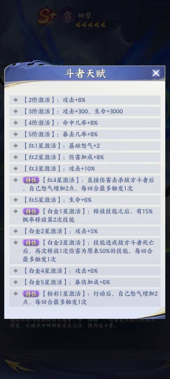 柳擎的天赋能力设计也与他战斗定位紧密结合,每激活一层天赋,他的实力都会得到增强。当提升至红四星时,柳擎在击杀敌人后可以快速回复怒气值;达到白金一星后,他在释放技能时还有概率再次施放技能,从而形成高效的输出循环。这些天赋效果让他在持续作战中能保持强大的压制力。