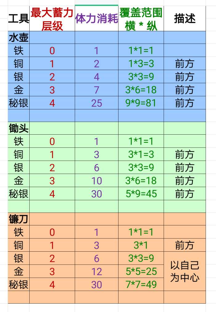 工具升级后可以提高劳动效率,每升级一次增加一层蓄力层级。长按劳动键可以蓄力,蓄力层级随时间逐步增加。水壶、锄头和镰刀的资料如下: