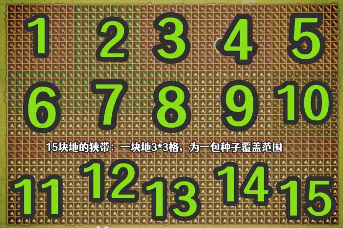 全农场土地45*30=1350格,以一包种子的覆盖面积(3*3格)算一块地,则全农场有150块地。以秘银水壶最大蓄力覆盖面积(9*9格)算作一垄,全农场可以分做15个垄,外加15块地拼成的狭带。如图: