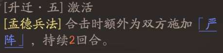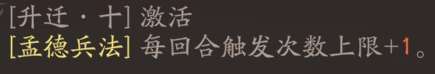 3阶触发次数+1,依然要求和曹操本人触发合击时才能发动。本质上是每回合最多可以给2人施加<昂扬>和<严阵>。