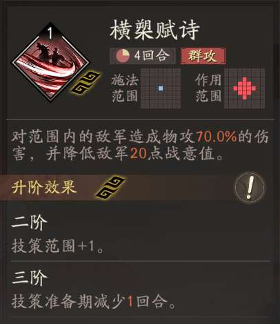 范围很大,威力也不错的范围攻击,有宝贵的降低敌人战意的特殊功能,可惜冷却期过长,也无法快速获得3阶,一般情况下并不推荐使用,未来达到升迁9,兵营养成跟上后应该有不俗的表现。