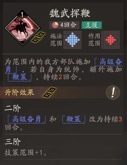 任何氪金度都可以感受到强度的王牌辅助技能,注意<高级奋勇>是一个通用增益buff,和<威震华夏>是覆盖关系而不是叠加。<鞭策>要求曹操为统帅职业再可以触发,一定程度上要求玩家对输出和辅助做出抉择。是任何氪金度和培养度都推荐携带的重要辅助技能。