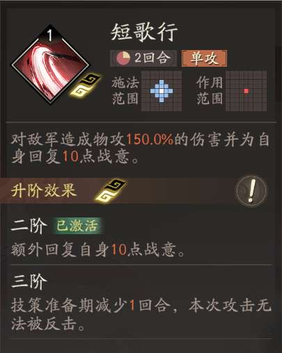 骑兵的泛用单体伤害技能,系数其实不错,但是考虑到<短歌行>的冷却期并不长,输出环境也更好以及获取本技能需要开启骑兵线的成本,一般不推荐使用本技能。
