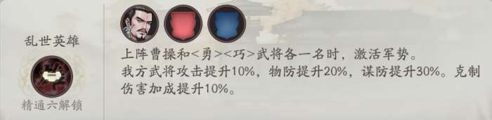 免费赠送的优质军势技能,由于曹操是<严>,军势定位非常符合三望的三角克制关系,推荐使用的军势技能之一。