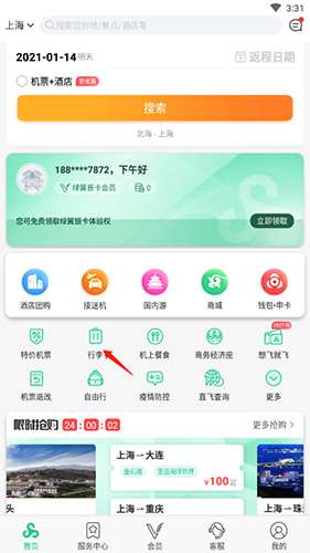 1、打开软件,点击底端的“首页”选项,然后点击“行李”选项。