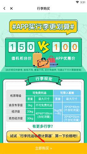 2、进入行李购买页面,点击底端的“立即购买”选项,然后就可以购买托运行李额。