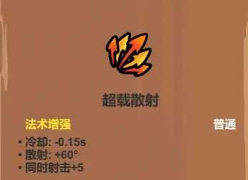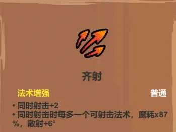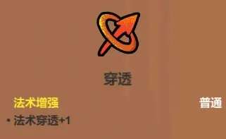 让你一些单体输出法术能拥有一定的群体杀伤能力(如魔法弹、激光、滚石),激光+穿透+反射更是能打出花里胡哨的刮痧效果,仅在少部分套路里可以使用,比如书叠书激光流就可以考虑用一下(但激光升级后自带穿透,实际也没太大用处),搭滚石寻踪之类的倒是还行。