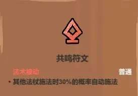 其他法杖施法时(包括杖灵及魔导书施法),放上共鸣符文的法杖就有概率自动施法,搭配各种高频率施法的法术机关枪体系都很好用,把核心输出体系放在副杖中由共鸣启动也可以避免一些蓝耗较高的法术打空蓝条导致你被怪贴脸却放不出法术的尴尬,也可以在手持魔女扫帚这种需要自己手持的功能性法杖时把核心输出法术放在副杖用共鸣启动,也能在你法术体系未成型之前尽可能利用好背包里更多的法术去提高你的输出。总之,这是一个泛用性非常广的法术。这法术只是普通等级,很好升级,但一般最多一星也就够用了。