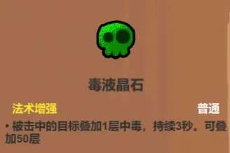 优秀的自杀法术,搭配滚石等法术能铺满全场无差别伤害毒液,在你没飞行的情况下,能直接把你跟你的召唤物逼死。啊?你说对怪物上毒?讲真,在中后期动不动几千几万秒伤的前提下,毒这点伤害真的不够看。前期伤害缺乏怪物血少倒是可以用一下,搭配蝴蝶黑洞等多段伤害的法术能快速上毒,这些法术搭毒也不会留一地毒液。当然,还有一种玩法,就是搭感电王冠自己踩毒玩自爆玩法,这个可以看后面遗物介绍了解。