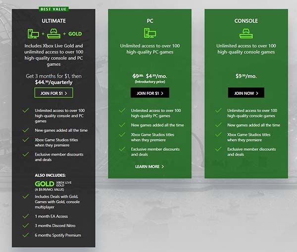 Xbox Game Pass(XGP)是微软推出的月费订阅服务。玩家只需每月交付固定费用,就可免费下载游玩Game Pass中所有游戏。微软新发售的第一方游戏则会在发售首日直接加入XGP。玩家花费9.99(约人民币70元)美元可分别订阅PC端或者Xbox主机端的XPG服务。或者选择季度(三个月)订阅费44.99美元(一个月约15美元)的终极会员。终极会员可游玩PC和Xbox端所有XPG游戏,同时附带金会员。有金会员的玩家才可游玩Xbox多人游戏。