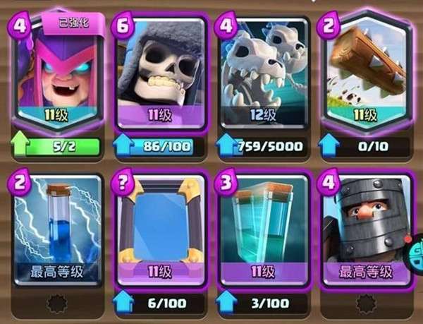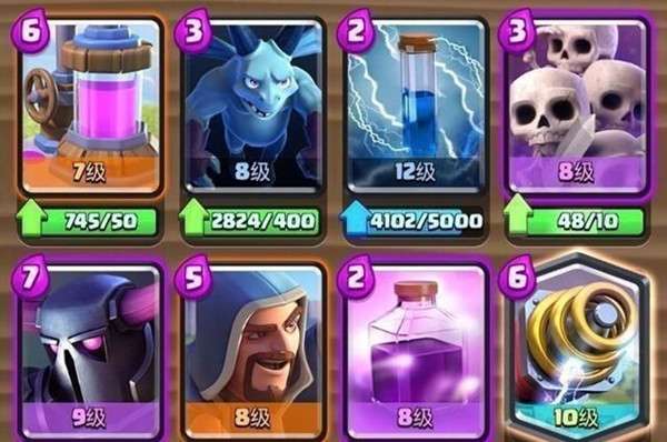 卡组构成:气球兵、冰冻、蝙蝠、狂暴樵夫、女枪、小电、电磁塔、骷髅军团。在“突然死亡模式挑战”中会遇见许多玩家都在玩冰冻气球卡组,这套阵容将其改良,利用电磁塔、狂暴樵夫、蝙蝠和女枪防守赚费,然后利用冰冻和气球兵输出即可。同时狂暴樵夫、女枪这些本来输出也很可观,所以用起来会非常顺手。由于主力还是气球兵,所以对方如果偏重于防空,也可以对这套阵容再次重组。