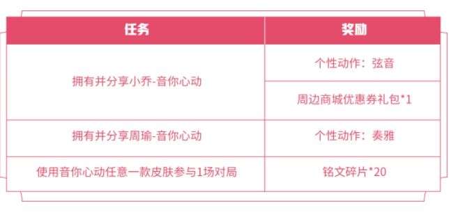 全新520音你心动系列皮肤即将上线,活动期间分享小乔-音你心动皮肤领全新皮肤动作:小乔-弦音+周边商城优惠券礼包*1,分享周瑜-音你心动皮肤领全新皮肤动作:周瑜-奏雅。