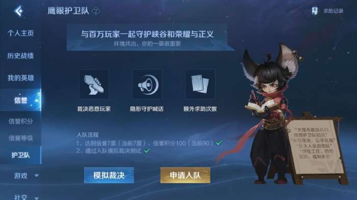 简单一点来说,小伙伴们只要保证自身的信誉等级7星以上,就可以通过上面的入口申请加入鹰眼护卫队了。而加入护卫队之后,各位就可以对游戏里的各种不健康行为进行监督和裁决。