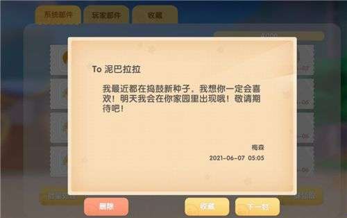 首先梅森好感度达到【知己】关系后,就有概率在当天写邮件给我们,查看系统邮件,梅森表示自己最近在捣鼓新种植,并且明天会出现在我们的家园中,敬请期待。