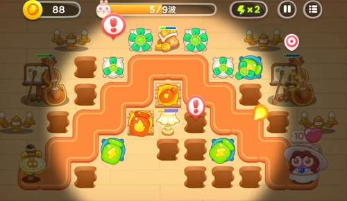 第2波开始有滑板兔,跑的贼快,出来就集火打掉。在最上方金币袋2侧布置2个风扇,基本上就覆盖了所有的路径,火瓶子清建筑物,凑空补刀即可。在出口和萝卜的空位附近,补2个普通瓶子,以防漏了兔子,就稳妥了。
