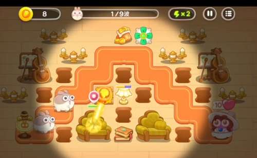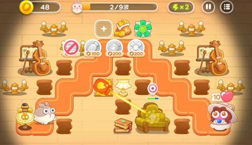 在灯塔的左侧建个2级火瓶子,剩下的钱可以在上方建个风扇,火瓶子集中打沙发挣钱,风扇打兔子的同时还能清建筑物。风扇如果有漏网的兔子,火瓶子记得补一下。打掉沙发后,先升级风扇,趁着空隙把灯全部打亮,继续打沙发。