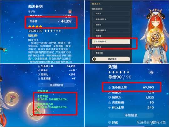 妮露自身在目前版本里只有全力堆血量才能勉强达到7万血量。这里建议千岩2+花海2的圣遗物(全部主词条生命),武器船坞长剑。