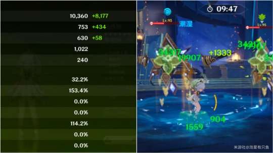 但这就是全部了么?并没有。在妮露队伍里,丰穰之核伤害其实还和触发者的精通有密切的关系,下面给大家展示一下。