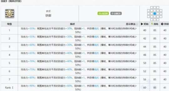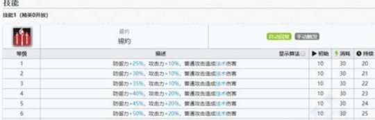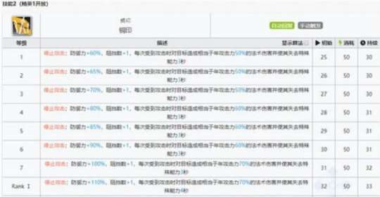 技能描述(7级):停止攻击并增加防御力100%,阻挡次数+1。每次受到攻击时,会释放一个法术对目标造成年攻击力70%的伤害,并使其失去特殊能力3秒。这个技能不仅可以防御,还有攻击效果,比起一级技能要强很多,可以专精于此。