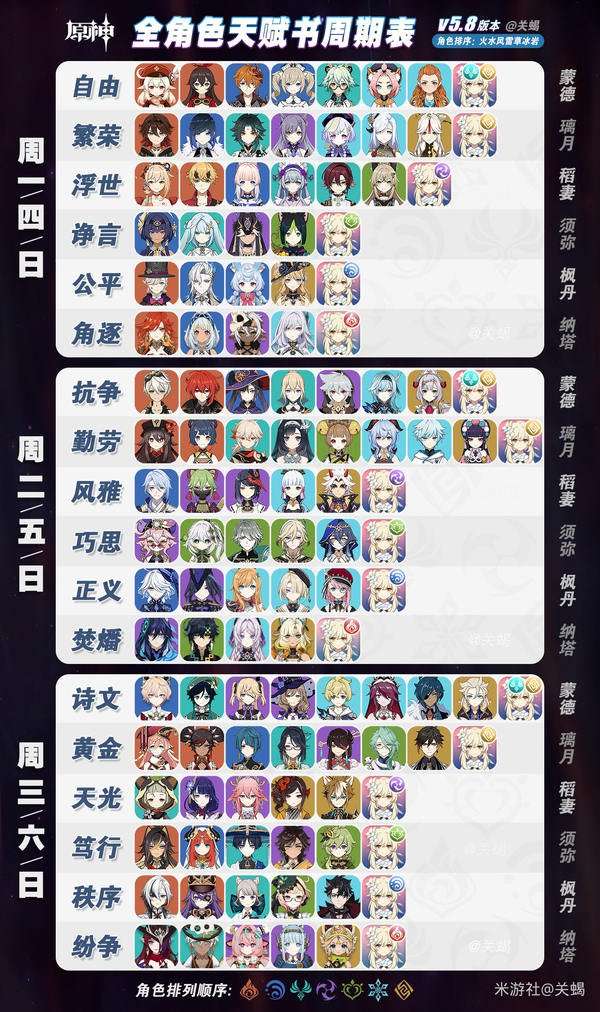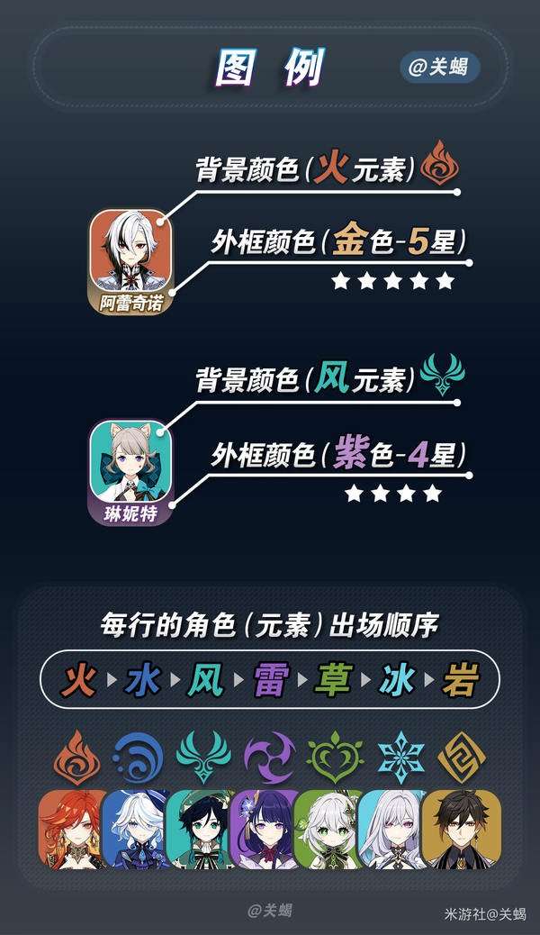 每行的角色出场顺序按各自的元素颜色排列: