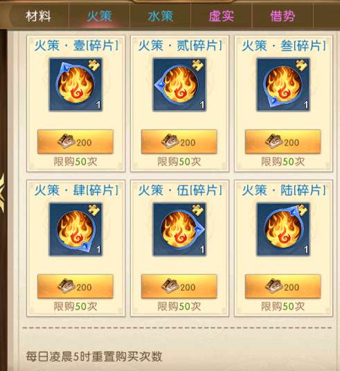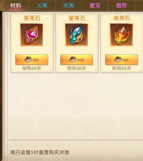 计策残页可以在计策商店中兑换计策进行升星,强化,洗练的道具和计策套装碎片,计策碎片集齐100个即可合成为一个整的计策装备。
