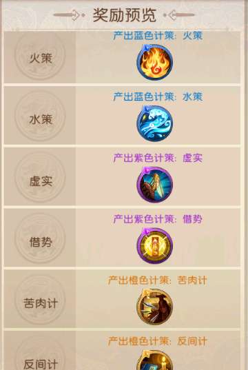 计策功能能为武将提供强力的属性跟额外技能,并且计策共分为蓝、紫、橙、红、金5种品质,品质越高,基础属性加成越多。