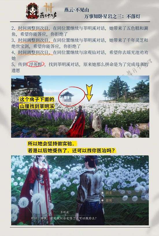 1、传到 浮英野找到莘明溪跟她对话,得知她经常做实验摔断腿,还得罪了城里的大夫,然后给她治好病,她想请你在她以后摔断了腿还能一直治疗她,如果你不答应,就一直在原地等下去