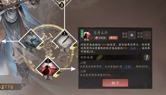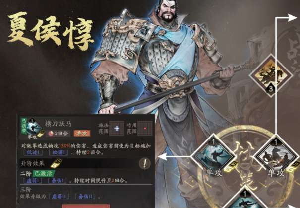 除此之外还需要为夏侯惇选择合适的技能。如果你处于前期的话,小编建议大家带一个横刀跃马,一个突进,这样的话配合被动技能雪恨,基本上能够覆盖大部分的战局。到了后期,小编比较推荐的技能是忠勇义烈和力战,其中忠勇义烈是一个收割型的技能,如果说你的场上还有其他输出的话,那么该技能可以配合主c完成收割。而力战可以让自己的攻击值和防御值得到进一步的提升,是一个非常好用的辅助技能。