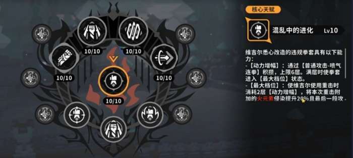 维吉尔的核心天赋混乱中的进化赋予了他强大的战斗机制。通过普通攻击喷气连拳可以积攒动力增幅,最多可积累6层。当达到满层时,拳套进入最大档位状态,为接下来的重击提供强力支持。在此状态下使用重击会消耗2层动力增幅,不仅提升20%火元素侵染效果,还能在最后一段攻击命中时为敌人附加灰头土脸状态。