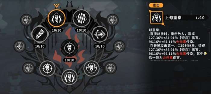 重击技能上勾重拳在直接施放时能造成127.36%+84.91%短兵伤害,并附加96.16%+64.11%的火元素侵染。在普通攻击第一或第二段后施放,虽然伤害不变,但最后一段会转化为纯粹的火元素伤害。在第三段后施放则能造成更强大的127.36%+84.91%火元素短兵伤害以及96.16%+64.11%的火元素侵染。