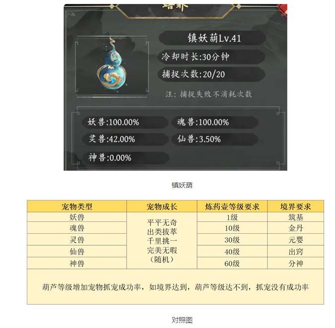 游戏核心就是抓宠,玩家可以通过使用镇妖葫来抓宠,妖兽、魂兽、灵兽、仙兽、神兽、X兽对境界及葫芦等级都有要求