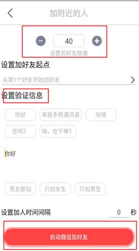 3、在【加附近的人】里,设置我们要加的好友数量,想说的话,性别方向,就可开启微信自动添加附近的人了!