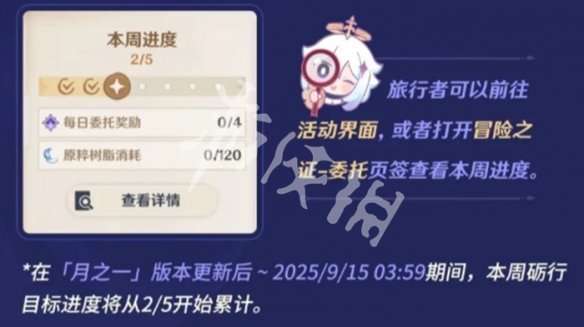 在接下来的12周活动期间,您需要在其中的任意8周内完成每周的「砺行目标」,即每周完成5次每日「砺行目标」,每日领取4次委托奖励,并消耗120点原粹树脂。