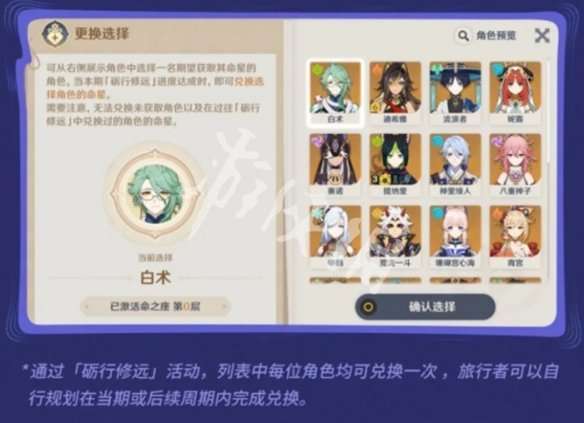 2、无法兑换尚未获得的角色或已经在之前的「砺行修远」活动中兑换过的角色的命星(每位角色一年内只能兑换一次!)