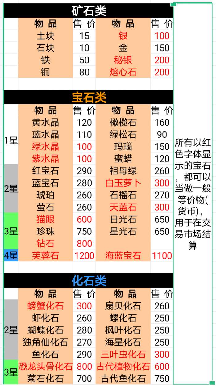 其实,打开交易市场,点我的摊位,上架,点下面要交换的物品,可以查看所有物品的出货价格。