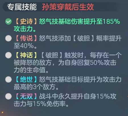 另外,在达到传说品质之后,他会无些技能还会额外添加一个破胆的效果,破胆这个状态属于孙策他目前自带的一个额外状态,效果在其中如果触发破胆的话,这里概率也会提升到40%的效果,想要用好破胆这个状态的话,那么下面的怒气技能大家就要好好了解一下,另外他在达到神话品质之后,可以根据破蛋的状态触发达到一个降落的效果,只要敌方目前存在一个被降落的目标,那么孙策就可以为自身带来50%攻击数值上面的生命恢复,所以这里他就算没有足够的奶妈支援后,期利用这个破胆的话,也可以为自己带来足够的生存加成效果。