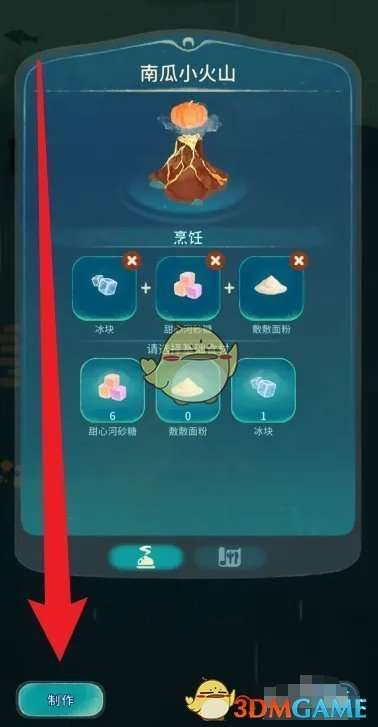 2、接着在烹饪页面,需要消耗冰块+甜心河砂糖+敷敷面粉,点击制作;